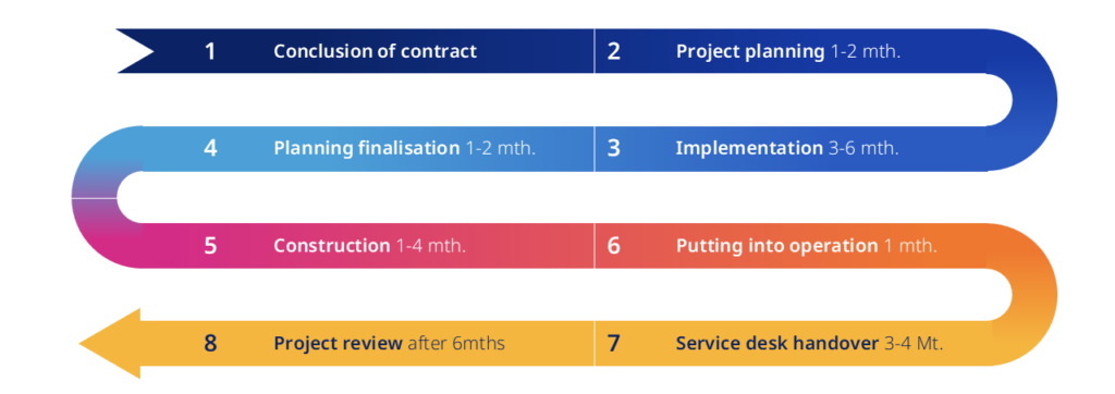 The project management team not only coordinates the individual construction phases, but also acts as a central point of contact for you, monitors the quality of the work and ensures that all legal requirements are met and that the schedule and budget are adhered to. Under the experienced leadership of our project management team, our installation team is on site to turn your power plant into reality. Your daily operations will not be disrupted. Depending on the size of the power plant, the construction time ranges from a few days to several weeks.